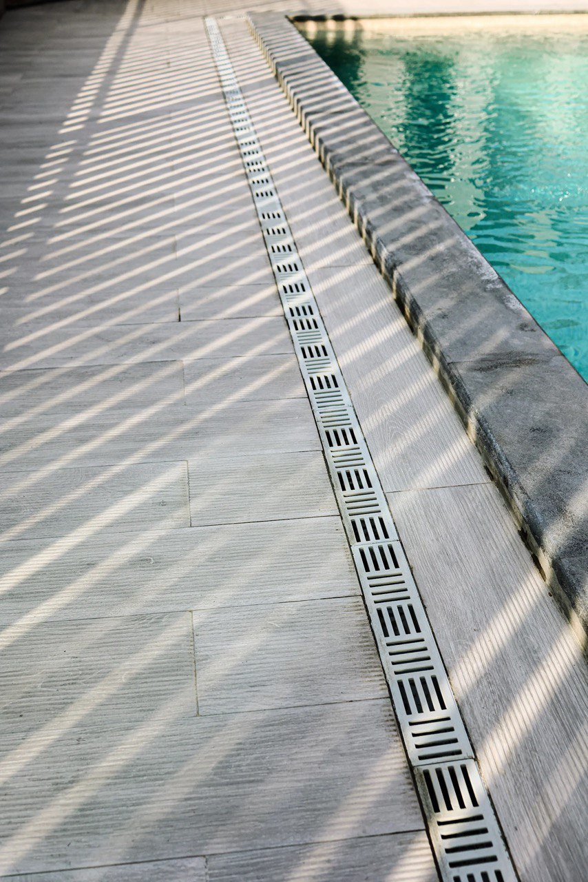Линейная система водоотвода аккуратно интегрирована в покрытие, сохраняя чистоту геометрии и минималистичный характер пространства. Сочетание графичной кромки бассейна, динамики солнечных теней и текстуры керамогранита формирует современную атмосферу курортного уюта с акцентом на детали.
